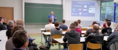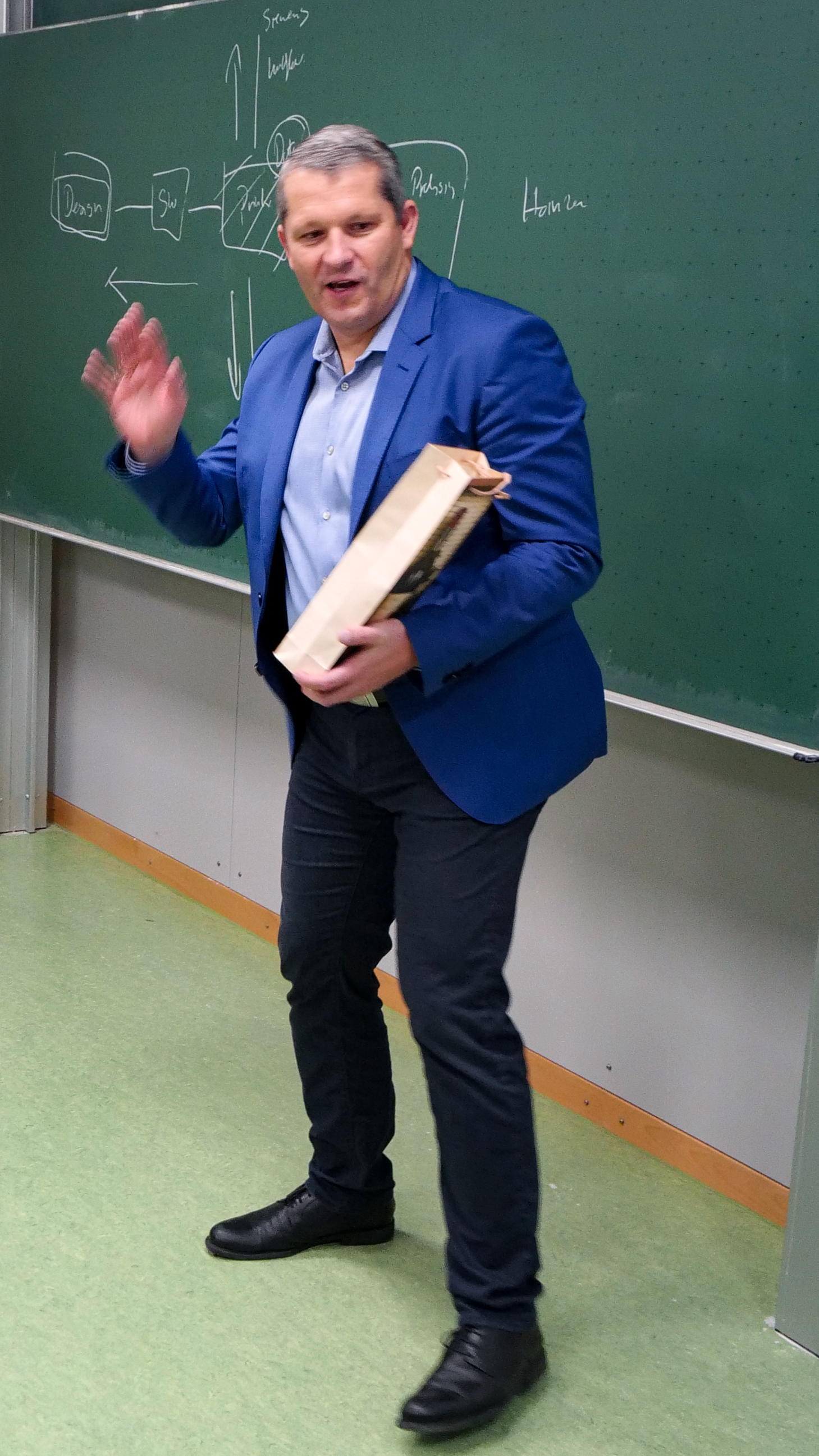 Tettnang, 14.10.2019: Was "Microfluidics" und "Voxel" mit Strategien globaler IT-Entwicklung und 'Digital Manufacturing' im Zeitalter von Industrie 4.0 zu tun haben - darüber referierte der (ab November 2019) zweite Mann an der Spitze des IT-Riesen HP Inc. (ehem. Hewlett-Packard Company), Christoph Schell (im Bild li.), am 14. Oktober an der Elektronikschule Tettnang.