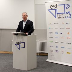 Anlass war die Übergabe und offizielle Inbetriebnahme eines 3D Printers von HP (Jet Fusion 540), die von est‑Schulleiter Jochen Würstle (im Bild zweiter v.r.) moderiert und vom Leiter des Amtes für Schule und Bildung des Schulträgers Bodenseekreis, Thomas Hilbert (im Bild r.), begleitet wurde.